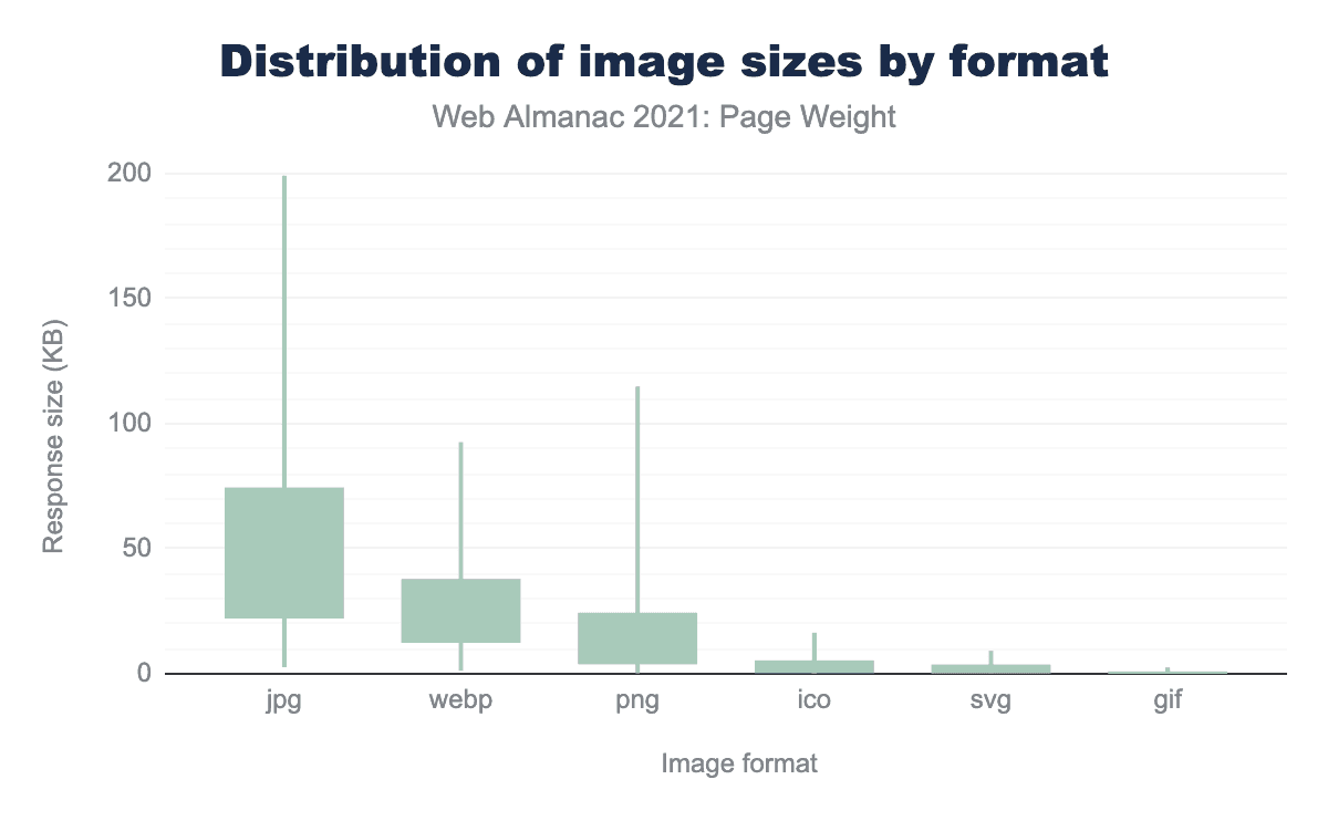 ウェブページの重量のうち、画像が大きな割合を占めていることが分かります。上の図は、画像の重量の上位のソースと重量の配分を示しています。上位3つ。JPG、WebP、PNGです。昨年と比較すると、すべての主要なブラウザでようやくサポートされるようになったWebPの利用が増加していることがわかります。PNGは、アイコンやロゴなどのユースケースで依然として人気があります。