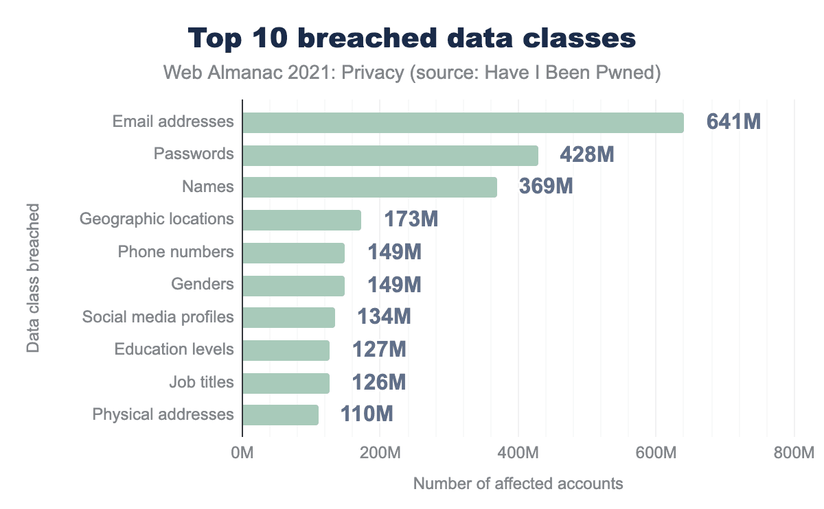 Have I Been Pwned が追跡したすべてのデータ侵害では、電子メールアドレスが漏れています。これは、ユーザーが自分のデータが侵害されたかどうかを問い合わせる方法だからです。電子メールアドレスの設定には、多くのユーザーがフルネームや認証情報を採用しているため、電子メールアドレスの流出は、すでに大きなプライバシーリスクとなっています。さらに、ユーザーの性別、銀行口座番号、完全な物理的住所など、他の多くの非常に機密性の高い情報が流出するケースもあります。