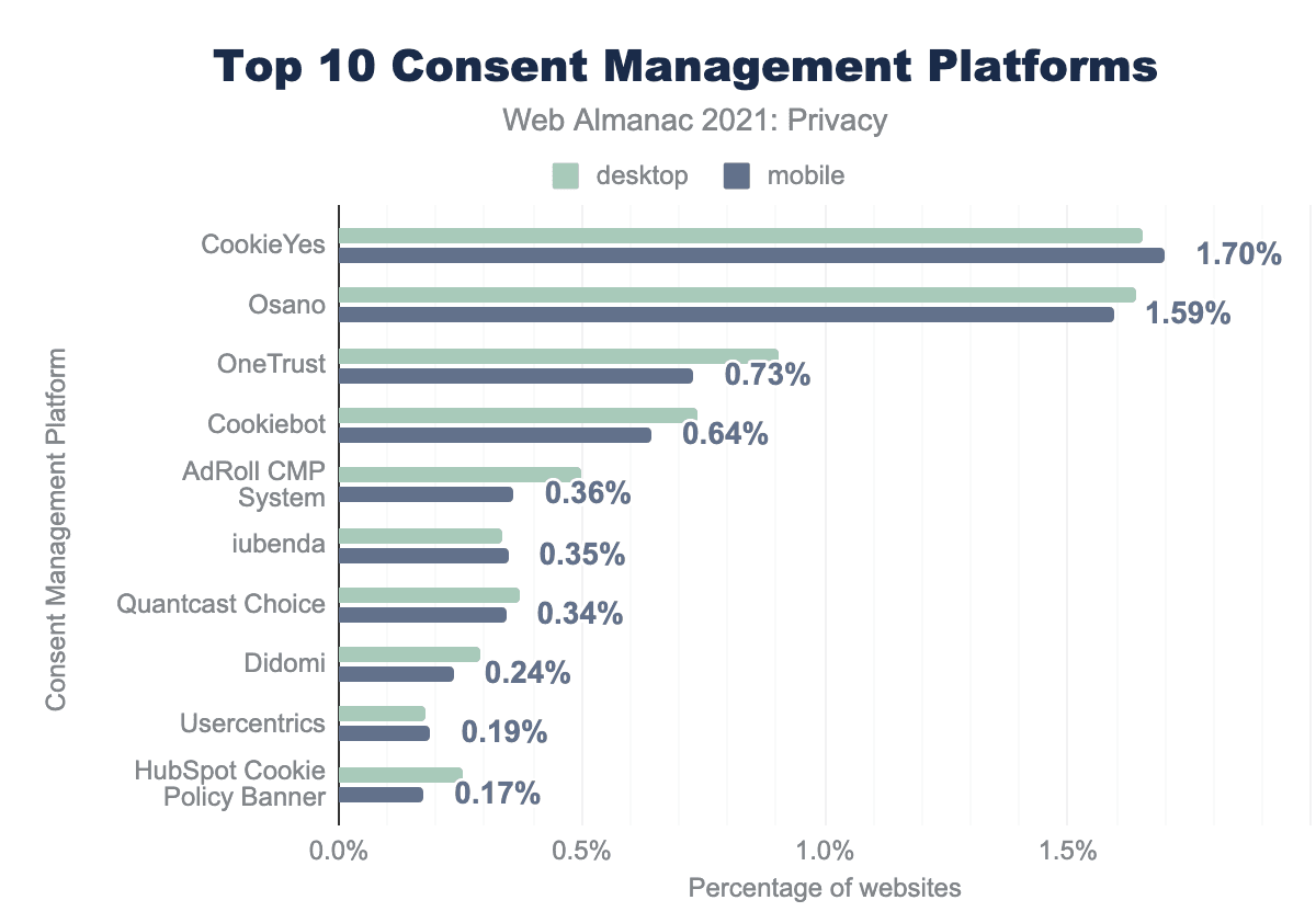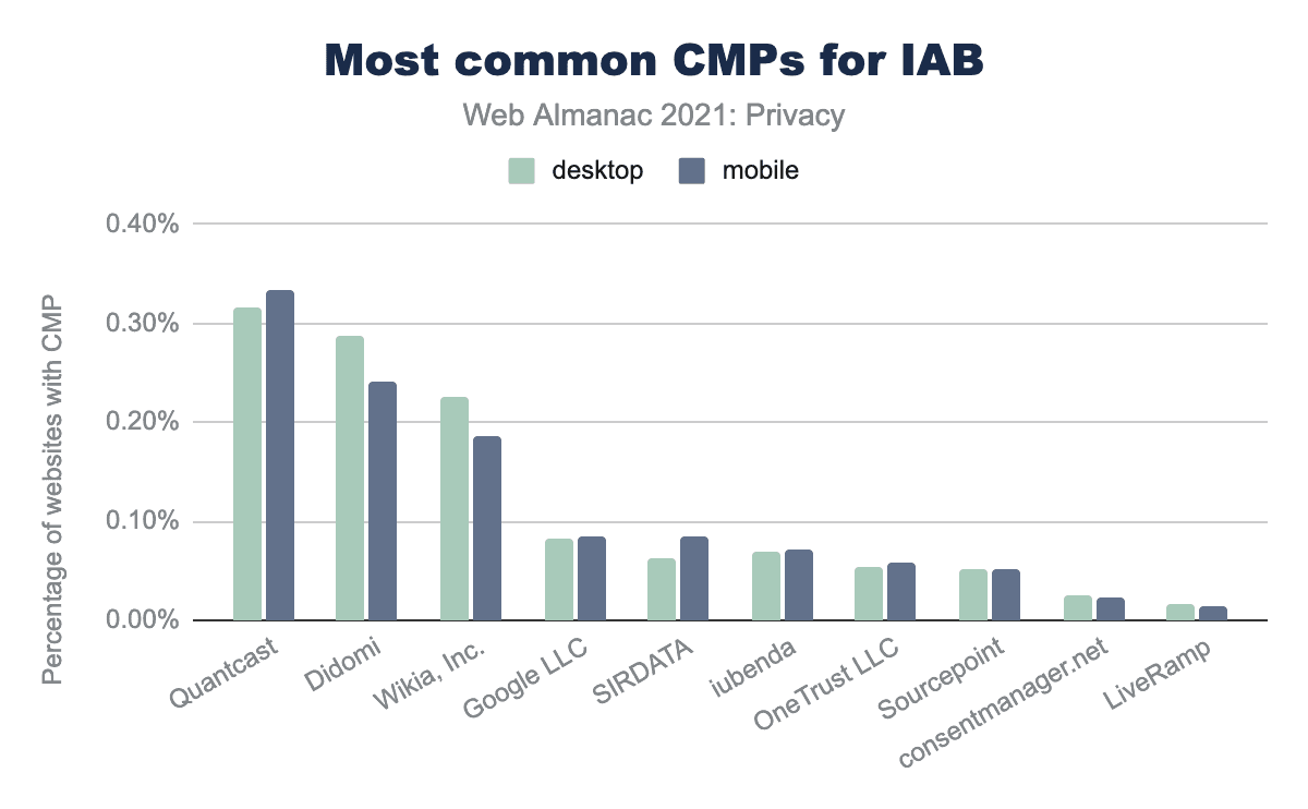 フレームワークに含まれる同意管理プラットフォームでもっとも人気のある10個の中で、トップはQuantcastでモバイルでは0.34%となっています。その他、Didomiが0.24%、Wikiaが0.30%と、人気の高いソリューションとなっています。