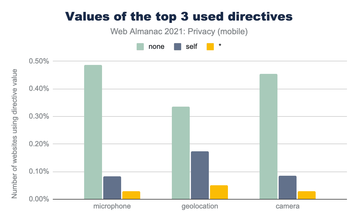 マイクロフォンは、モバイルサイトの0.08%でselfに、0.49%でnoneに、0.03%で*に設定されています。geolocation はモバイルサイトの0.17%で self に設定され、0.34%で none に設定され、0.05%で * に設定されています。カメラ はモバイルサイトの0.09%で self に設定され、0.46%で none に、0.03%で * に設定されています。none がもっともよく使われる値です。これは、トップレベルおよびネストされたブラウジングのコンテキストで、その機能が無効であることを指定します。2番目によく使われる値である self は、現在のドキュメントと同じオリジン内でその機能を許可することを指定するために使われます。一方 * は、オリジンをまたいだ完全なアクセスを許可します。