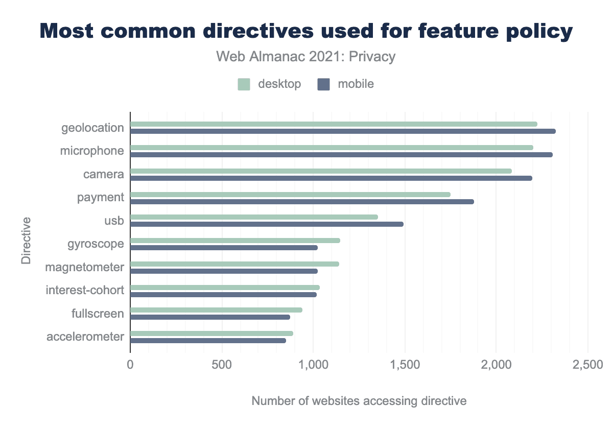 ジオロケーションはデスクトップ2,222サイト、モバイル2,323サイト、マイクでは2,199サイト、カメラでは2,082サイト、2,197サイト、支払いでは1,748サイト、1,879サイト、usbでは1, 354と1,492、ジャイロスコープが1,145と1,025、磁力計が1,141と1,024、インタレストコーホートが1,037と1,019、フルスクリーンが940と873、加速度センサーが892と852です。フィーチャーポリシーに関連して、もっともよく使われるディレクティブは上記の通りです。モバイルでは3,049サイト、デスクトップでは2,901サイトで、マイク機能の利用が指定されています。これはデータセットのごく一部であり、まだニッチな技術であることを示しています。その他によく制限される機能は、ジオロケーション、カメラ、支払い機能です。