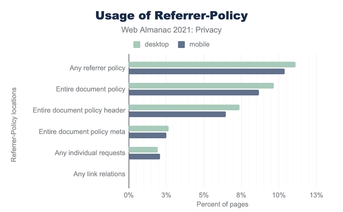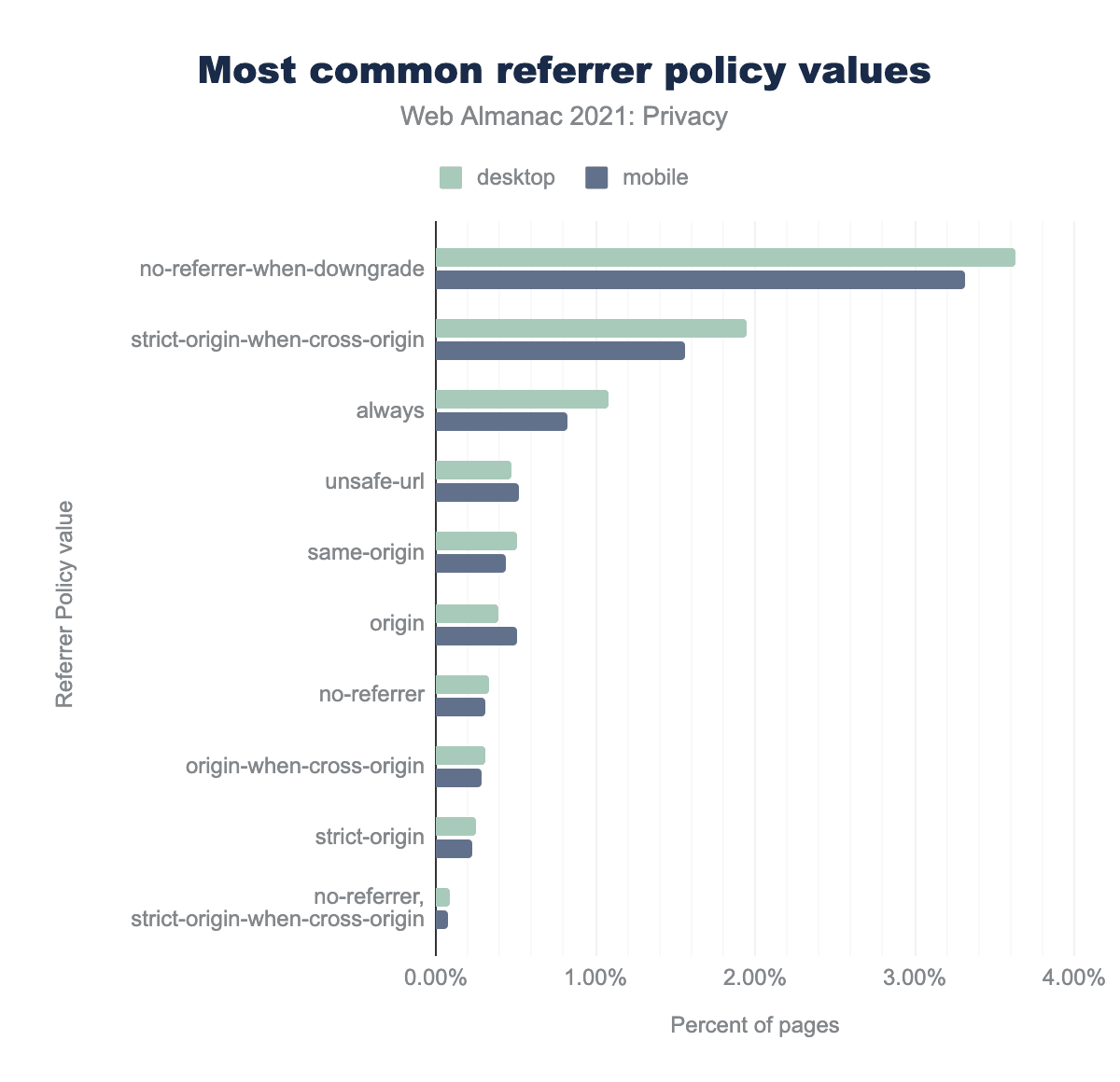 no-referrer-when-downgrade はデスクトップサイトの3.63% とモバイルサイトの3.31% で、 strict-origin-when-cross-origin はそれぞれ1.95%、1.56%。alwaysで1.08%、0.82%。unsafe-urlでは0.47%、0.52%。same-originは0.51%、0.44%。originが0.39%、0.51%。no-referrerは0.34%、0.31%。origin-when-cross-originで0.31%、0.29%。strict-originが0.26%、0.23%。最後に no-referrer, strict-origin-when-cross-origin が0.09% と0.08% になりました。明示的に設定されるもっとも一般的なReferrer Policyは、no-referrer-when-downgradeです。モバイルクライアントのウェブサイトの3.38%、デスクトップクライアントのウェブサイトの3.81%で設定されています。no-referrer-when-downgradeはプライバシーを強化するものではありません。このポリシーでは、ユーザーがあるサイトで訪れたページの完全なURLが、クロスオリジンのHTTPSリクエスト(リクエストの大部分)で共有され、この情報は他の当事者(オリジン)がアクセスできるようになります。