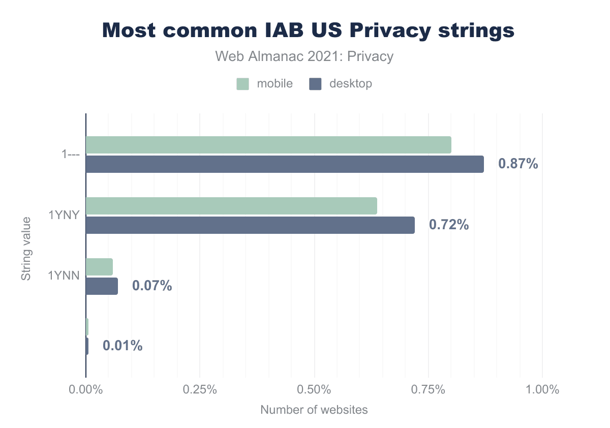 1----はデスクトップWebサイトの0.87%、モバイルWebサイトの0.80%、1YNYはそれぞれ0.72%、0.64%、1YNNでは0.07%、0.06%、ブランクが0.01%、0.00%で使用されていることがわかります。もっとも一般的なプライバシーに関する文字列は、1----です。これは、CCPAがウェブサイトに適用されないことを示し、したがってウェブサイトはユーザーに対してオプトアウトを提供する義務がないことを示します。CCPAは、個人情報の販売を主業務とする企業、またはデータ処理を行う企業で年間売上高が2500万ドル以上の企業にのみ適用されます。2番目に多い文字列は、1YNYです。これは、ウェブサイトが「データの販売をオプトアウトするための通知と機会」を提供したが、ユーザーが個人データの販売をオプトアウトしていないことを示すものです。