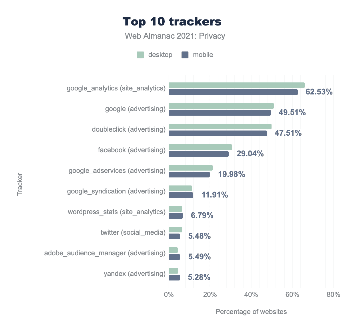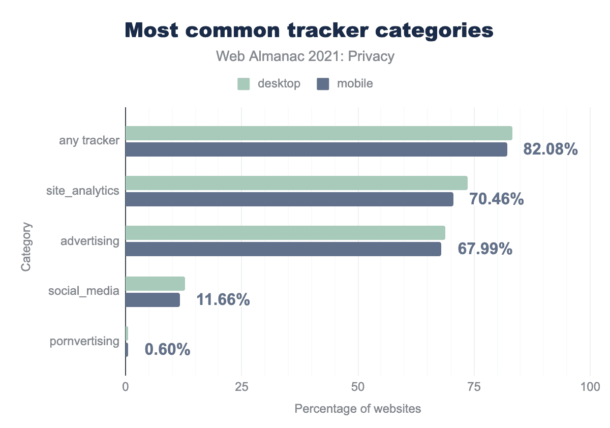 サイト分析は73.53%と70.46%、広告は68.83%と67.99%、ソーシャル・メディアは12.89%、11.66%、ポルノ広告 0.56%、0.60%でそれぞれ使用されていることがわかります。全体では、モバイルサイトの82.08%、デスクトップサイトの83.33%が少なくとも1つのトラッカーを含んでおり、通常はサイト分析または広告目的のために利用されています。