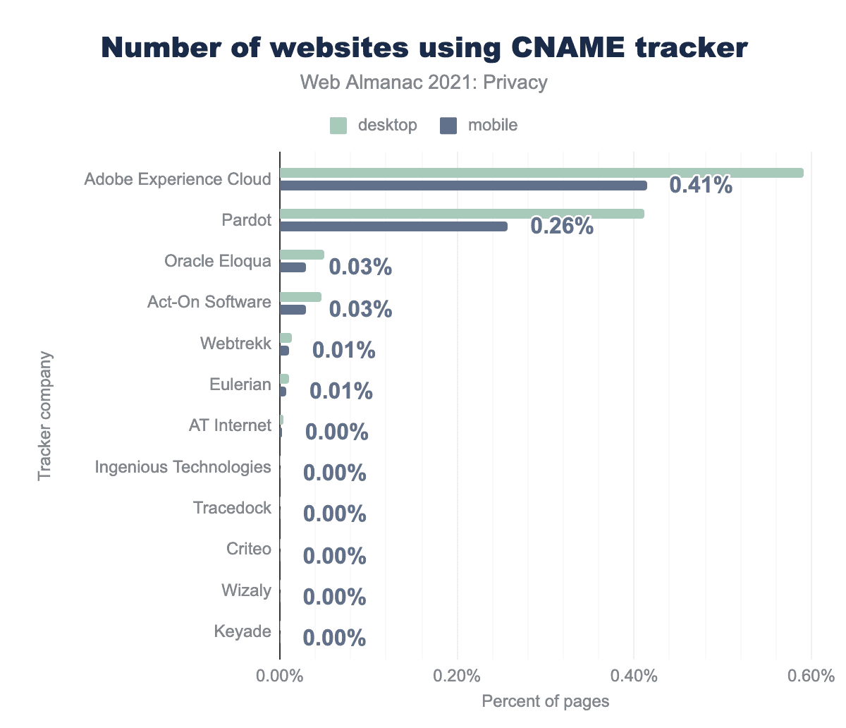 CNAMEベースのトラッキングを実行しているもっとも人気のある企業はAdobeで、デスクトップWebサイトの0.59%、モバイルWebサイトの0.41%に存在しています。また、規模ではPardotが0.41%、0.26%と顕著です。