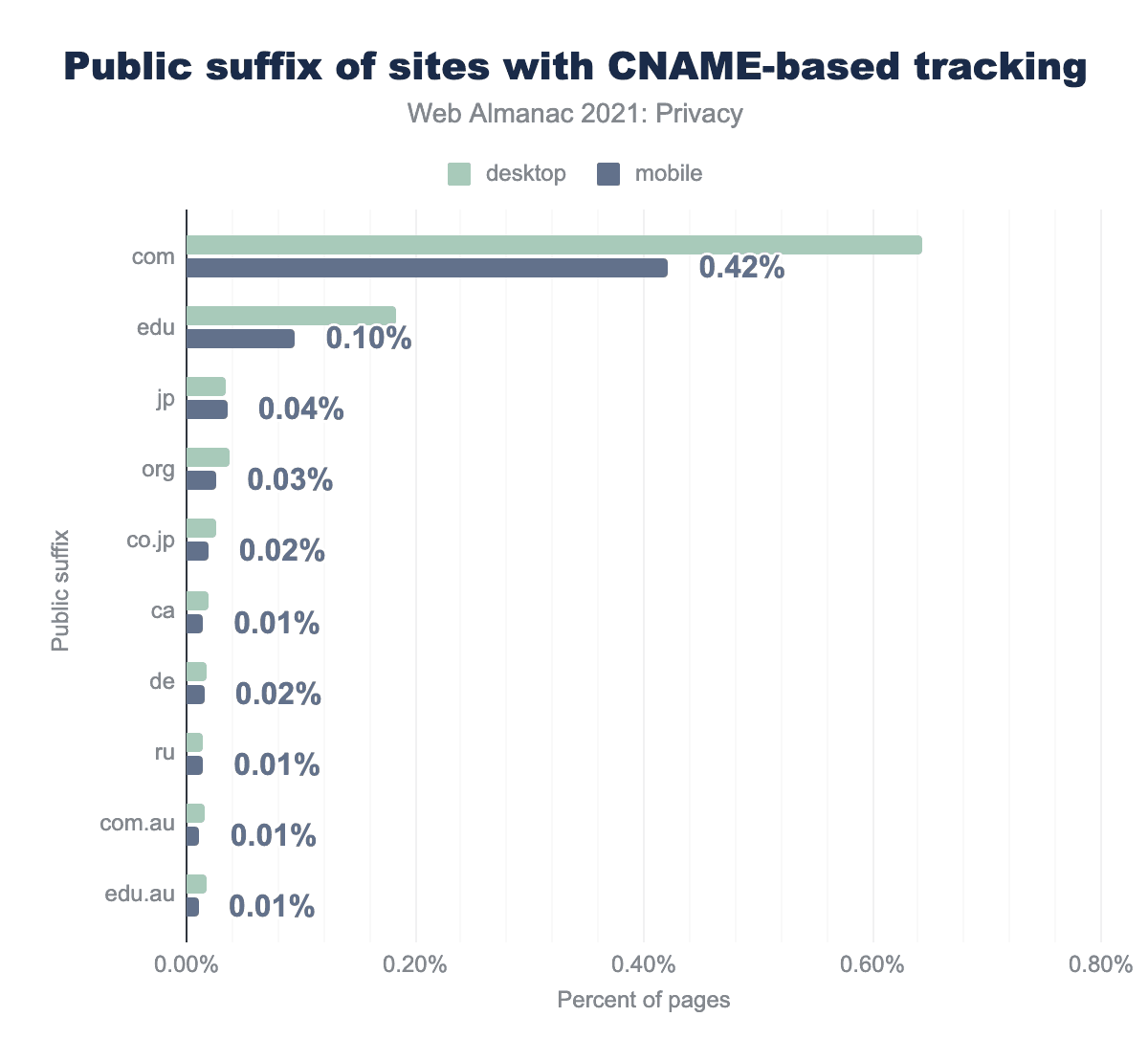 comのデスクトップWebサイトの0.64%、モバイルWebサイトの0.42%がCNAMEトラッキングを使用しており、eduではそれぞれ0.18%と0.10%、jpでは0.03%と0.04%、orgでは0.04%、0.03%、 co.jp は0.03%、0.02%、 ca では0.02%、0.01%、 de では0.02%、0.02%、 ru では0.01%、0.01%、 com.au では0.02%、0.01%、最後に edu.au は0.02%、0.01% となりました。.com サフィックスとは別に、CNAMEベースのトラッキングを使用しているウェブサイトの多くは .edu ドメインを持っています。また、CNAMEトラッカーは .jp と .org ウェブサイトに多く存在します。