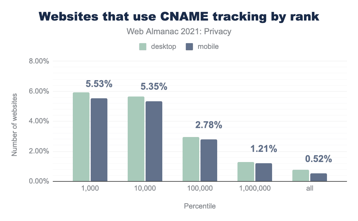 サードパーティトラッキングのブロックを回避するテクニックを続けると、CNAMEトラッキングは、ファーストパーティのサブドメインがDNSレベルでCNAMEレコードを使ってサードパーティサービスの使用をマスクするという新しい方法です。ブラウザから見ると、すべてがファーストパーティの文脈で行われるため、サードパーティの対策は一切適用されない。AdobeやOracleなどの大手トラッキング会社は、すでにCNAMEトラッキングソリューションを顧客に提供しています。 この章に含まれるCNAMEベースのトラッキングの結果については、この章の著者の一人(および他の人)によって完成した 研究 を参照し、DNSデータとHTTP Archiveからのリクエストデータに基づいてCNAMEベースのトラッキングを検出する方法を開発しました。