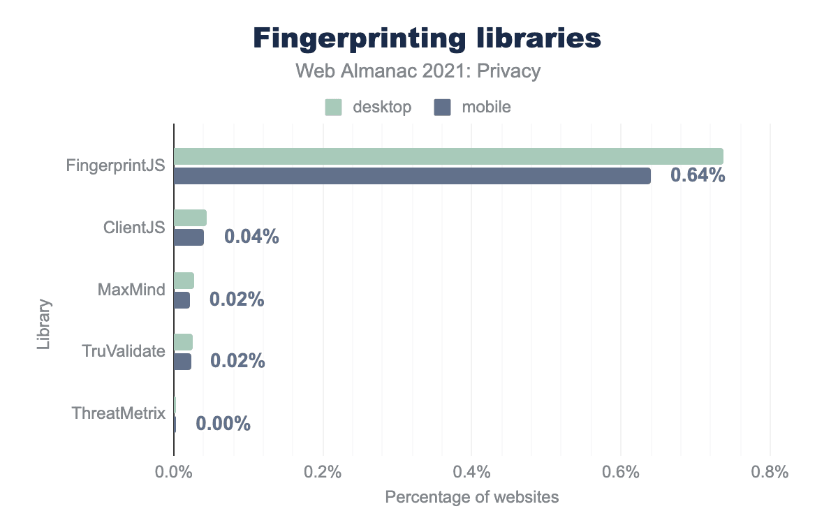 これらのサードパーティ サービスを使用しているWebサイトの割合から、もっとも広く使用されているライブラリである Fingerprint.js は、デスクトップでは2番目に多く使用されているライブラリの19倍も使用されていることがわかります。しかし、ユーザーのフィンガープリントに外部ライブラリを使用しているWebサイトの割合は、全体としては非常に小さいものです。