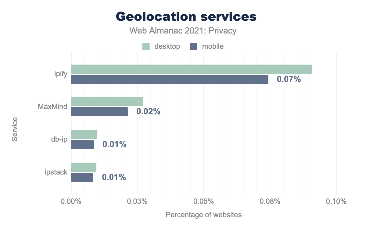 もっとも人気のあるサービスであるipifyは、デスクトップWebサイトの0.09%とモバイルWebサイトの0.07% で使用されていることがわかります。つまり、ジオロケーションサービスを利用しているウェブサイトは少ないようです。