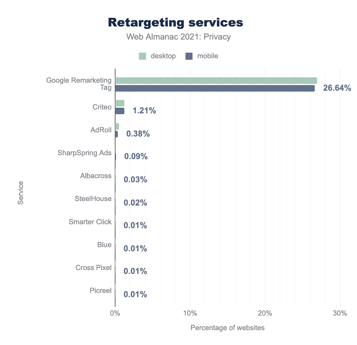 多くのトラッカーが広告再ターゲティングのためのソリューションを提供しています。もっとも広く利用されているGoogle Remarketing Tagは、デスクトップのウェブサイトの26.92%、モバイルのウェブサイトの26.64%で利用されており、それぞれ1.25%未満で利用されている他のサービスよりはるかに優れています。