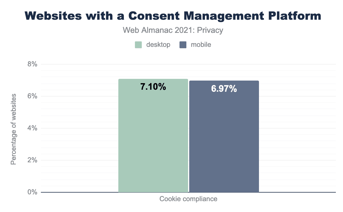 同意書管理プラットフォーム(CMP)は、ウェブサイトがユーザーのためにクッキーの同意バナーを提供するために組み込むことができるサードパーティライブラリです。約7%のWebサイトがCMPを利用していることが確認されています。