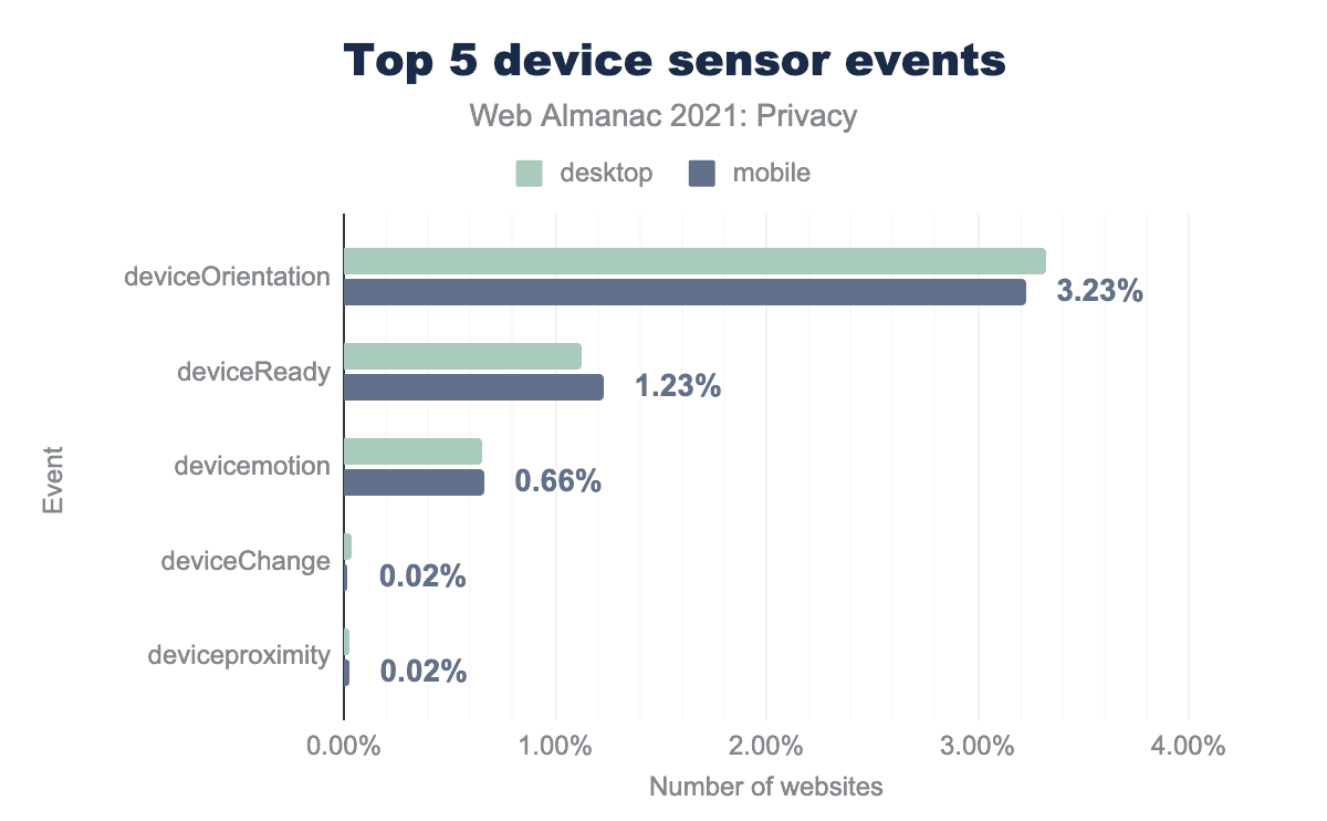 センサーは、ウェブサイトをよりインタラクティブへするのに便利ですが、指紋認証のために悪用される可能性もあります。JavaScriptのイベントリスナーの使用状況から、モバイル、デスクトップクライアントで、デバイスの向きがもっともアクセスされていることがわかります。なお、Webサイト上でイベントリスナーの存在を検索したが、実際にコードが実行されたかどうかはわからない。したがって、本節のデバイスセンサーイベントへのアクセスは、上限値です。