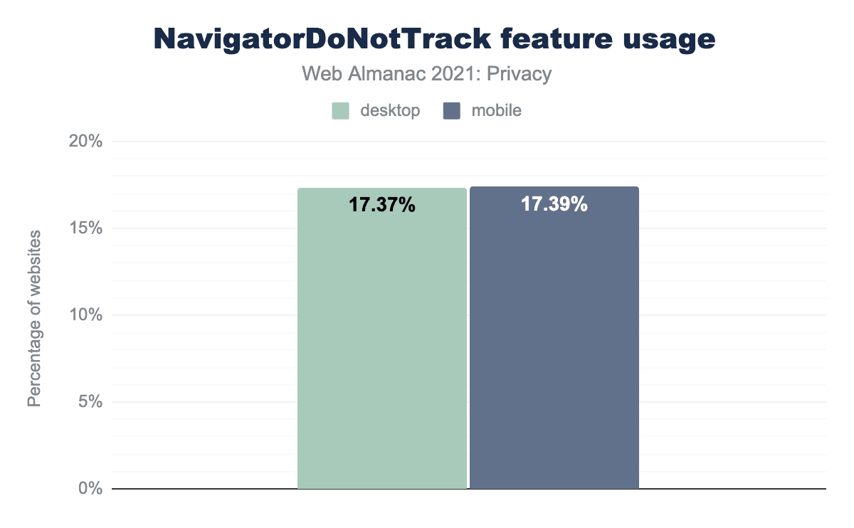 NavigatorDoNotTrack機能を使用してDNTの価値にアクセスするウェブサイトの割合を示す棒グラフ。デスクトップサイトの17.37%、モバイルサイトの17.39%がアクセスしています。モバイルクライアントとデスクトップクライアントでは、ほぼ同じ割合のページでDNTが使用されています。しかし、実際には、DNTのオプトアウトを尊重するウェブサイトはほとんどありません。DNTを規定するTracking Protection Working Groupは、2018年に閉鎖された。「サポート不足」のためです。Safariはその後、DNTのサポートを止め、フィンガープリント への悪用の可能性を防止するようにしました。