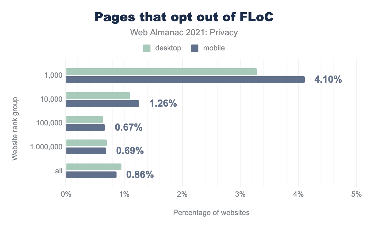上位1,000サイトのうち、4.10%がFLoCをオプトアウトしていることがわかりました。全ウェブサイトのオプトアウト率は1%未満です。