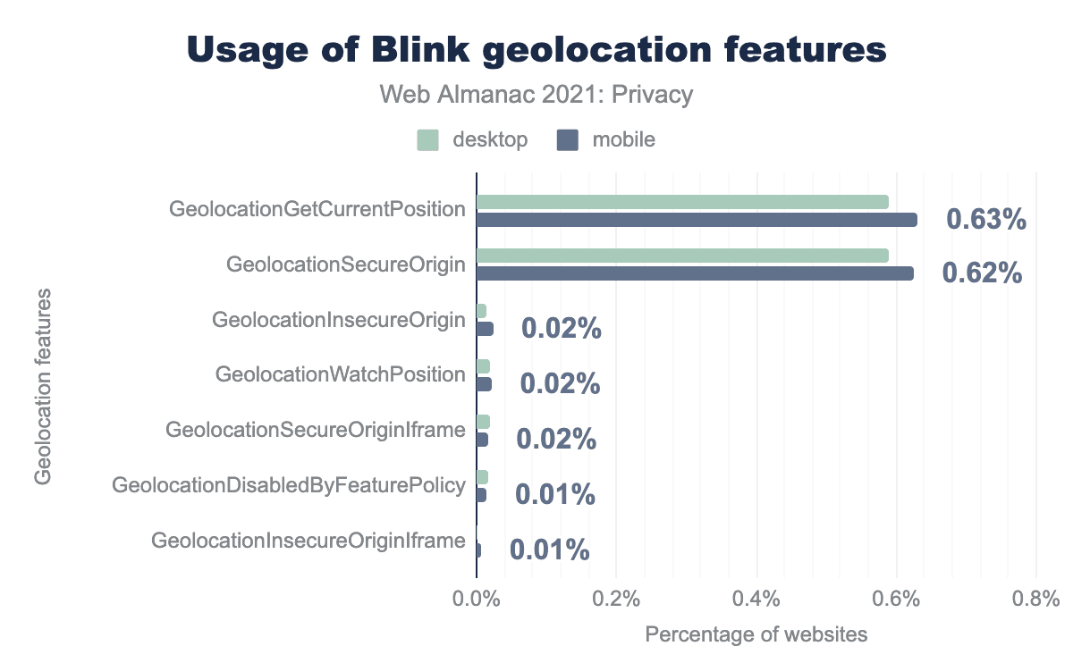 GeolocationGetCurrentPosition はデスクトップサイトの0.59%とモバイルサイトの0.63% で、GeolocationSecureOrigin はそれぞれ0.59%と0.62% で、GeolocationInsecureOriginは0.01%と0.02%, GeolocationWatchPositionが0.02%と0.02%, GeolocationSecureOriginIframeが0.02%と0.02%, GeolocationDisabledByFeaturePolicyが0.02%と0.01% そして最後に GeolocationInsecureOriginIframeは0.00%と0.01%となりました。また、WebサイトからはWebブラウザAPIを介して、ジオロケーションデータにアクセスすることが可能です。デスクトップクライアントで0.59%、モバイルクライアントでは0.63%のWebサイトがユーザーの現在位置にアクセスしていることがわかります(ブリンク機能に基づいています)。