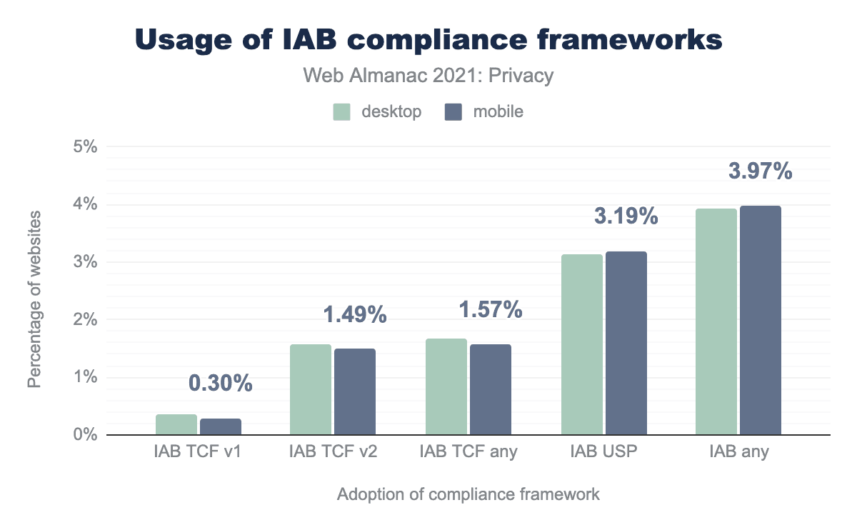 上図は、TCFとUSPの両バージョンの使用率分布を示したものです。なお、今回のクロールは米国をベースにしているため、TCFを導入しているウェブサイトは多くないと思われる。TCFを使用しているサイトは全体の2%以下ですが、USプライバシーフレームワークを使用しているサイトはその2倍です。