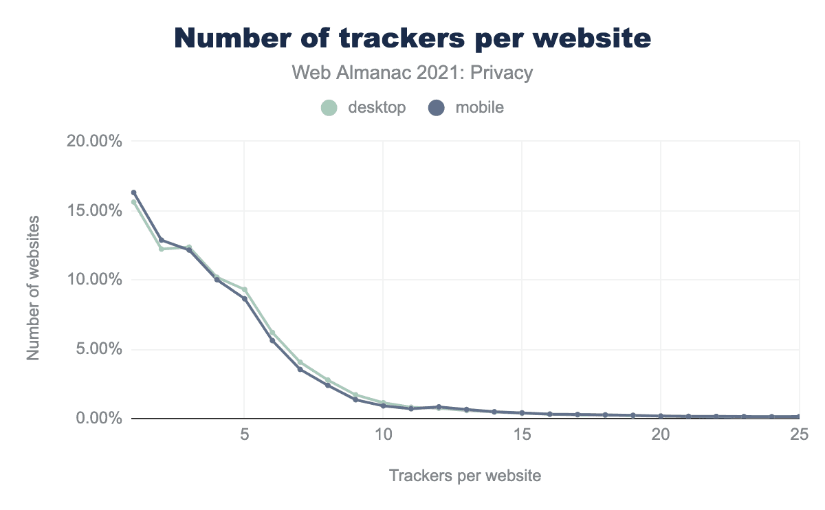 4つのウェブサイトのうち3つはトラッカーが10個以下ですが、それ以上のトラッカーを持つサイトもあり、あるデスクトップ・サイトでは133個(!)の異なるトラッカーに接続しています。