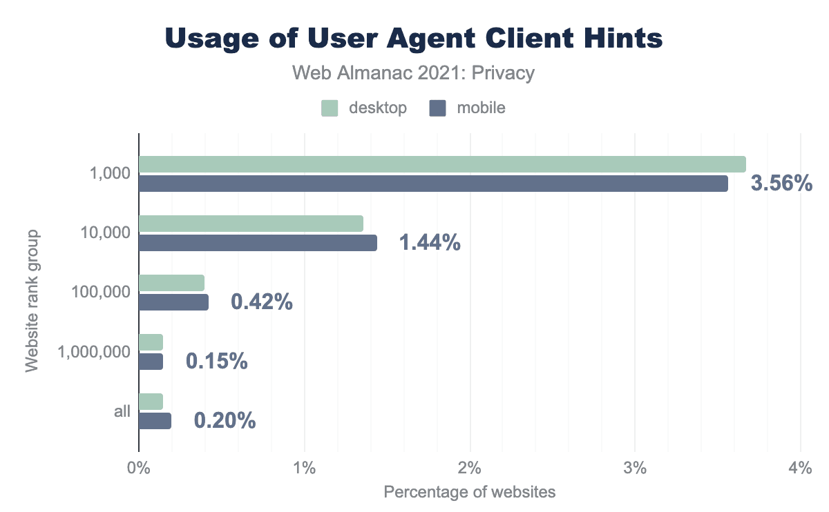 しかし、現時点では、クライアントヒントを導入しているWebサイトはほとんどありません。また、人気のあるWebサイトとそうでないWebサイトでは、クライアントヒントの利用状況に大きな差があります。モバイルで人気のある上位1,000のWebサイトのうち、3.67%がClient Hintsをリクエストしています。上位10,000のウェブサイトでは、実装率は1.44%に低下しています。