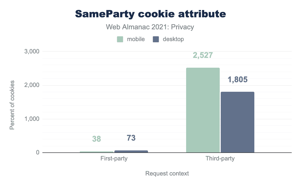 SamePartyは38のデスクトップサイトと73のモバイルサイトで使用されており、サードパーティークッキーでは、2,527のデスクトップサイトと1,805のモバイルサイトで使用されています。