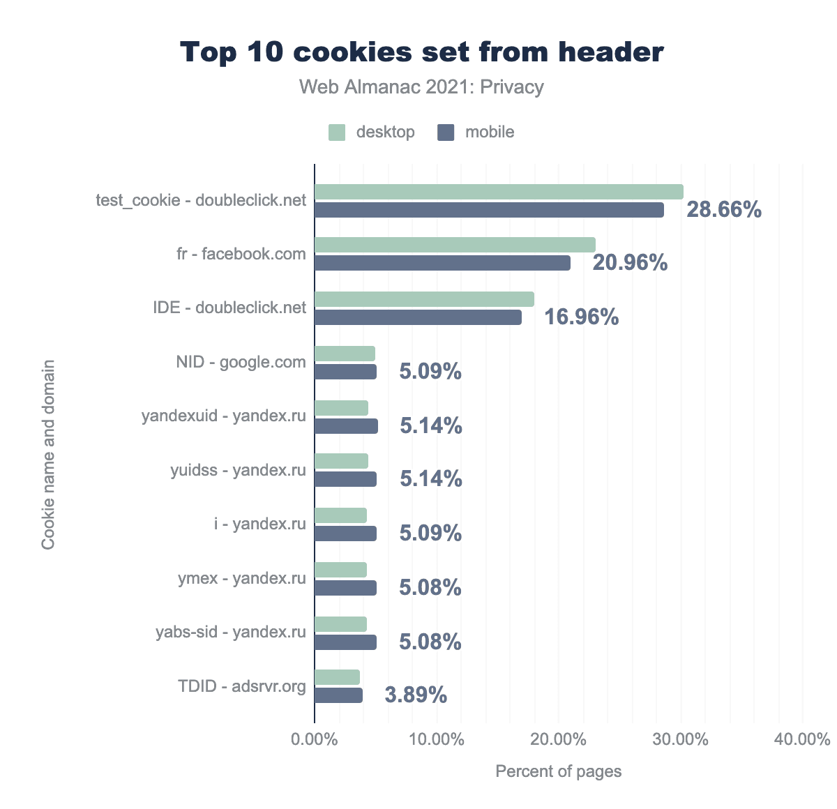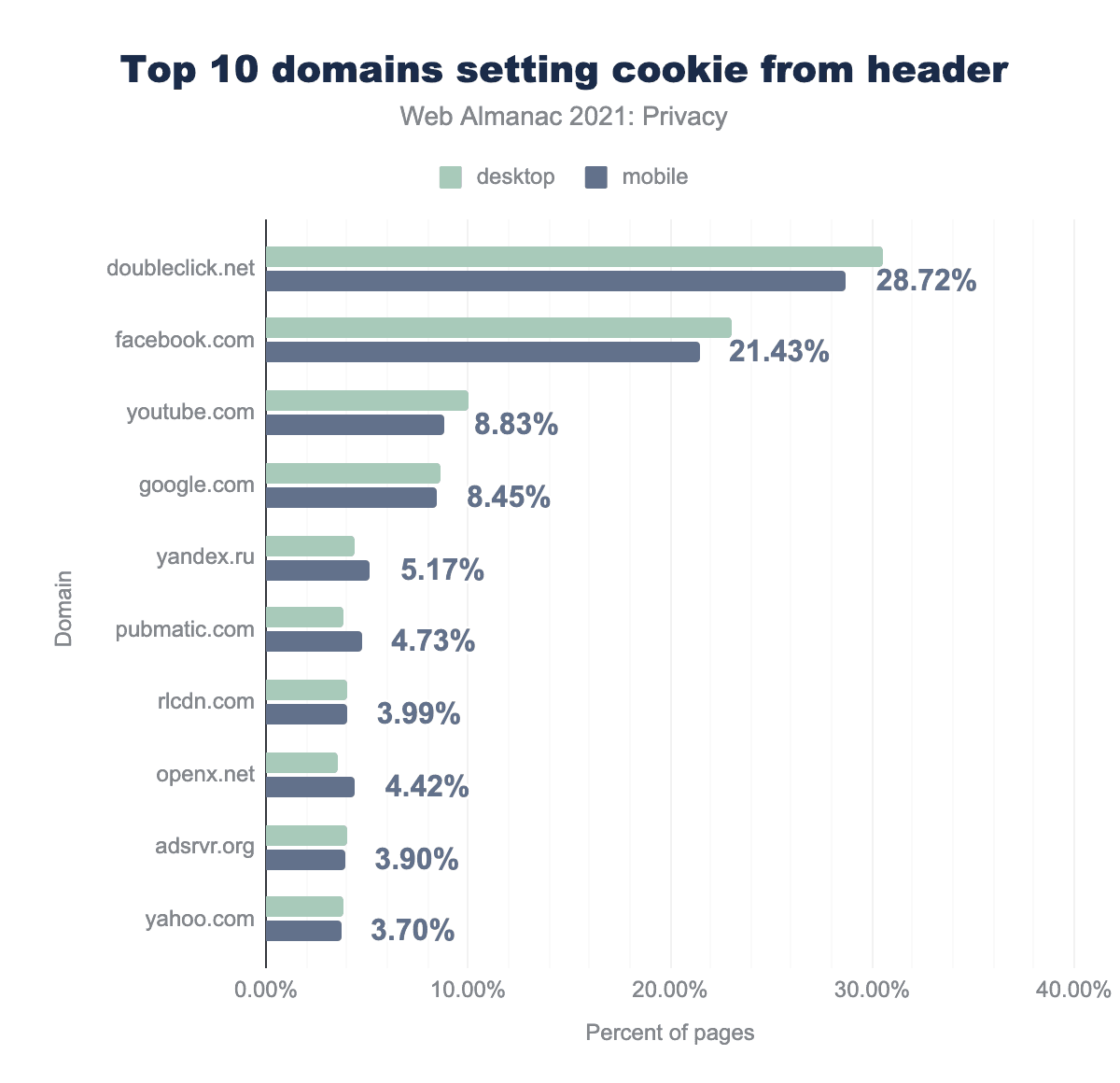 doubleclick.netはデスクトップページの30.49%、モバイルページの28.72%、facebook.comはそれぞれ23.07%、21.43%、youtube.comでは10.02%と8.83%、google.comは8.62%と8.45%、 yandex.ruは4.42%と5.17%、pubmatic.comは3.82%と4.73%。rlcdn.comが4.01%と3.99%、openx.netが3.57%と4.42%、adsrvr.orgが4.00%と3.90%、そして最後にyahoo.comが3.80%と3.70% といったところです。グーグルの子会社であるDoubleClickは、デスクトップサイトの31.4%、モバイルサイトの28.7%にクッキーを設定し、首位に立っています。もう1つの主要なプレーヤーはFacebookで、モバイルウェブサイトの21.4%にクッキーを保存しています。クッキーを設定する他の上位ドメインのほとんどは、オンライン広告に関連しています。