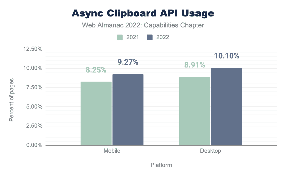 非同期クリップボードAPIは、デスクトップで2021年の8.91%から2022年には10.10%へと、またモバイルでは2021年の8.25%から2022年には9.27%へと使用率が増加しました。その結果、今年の非同期クリップボードAPIは、デスクトップとモバイルの両方で最も多く使用されたAPIとなり、昨年最も使用されたWeb Share APIを上回りました。