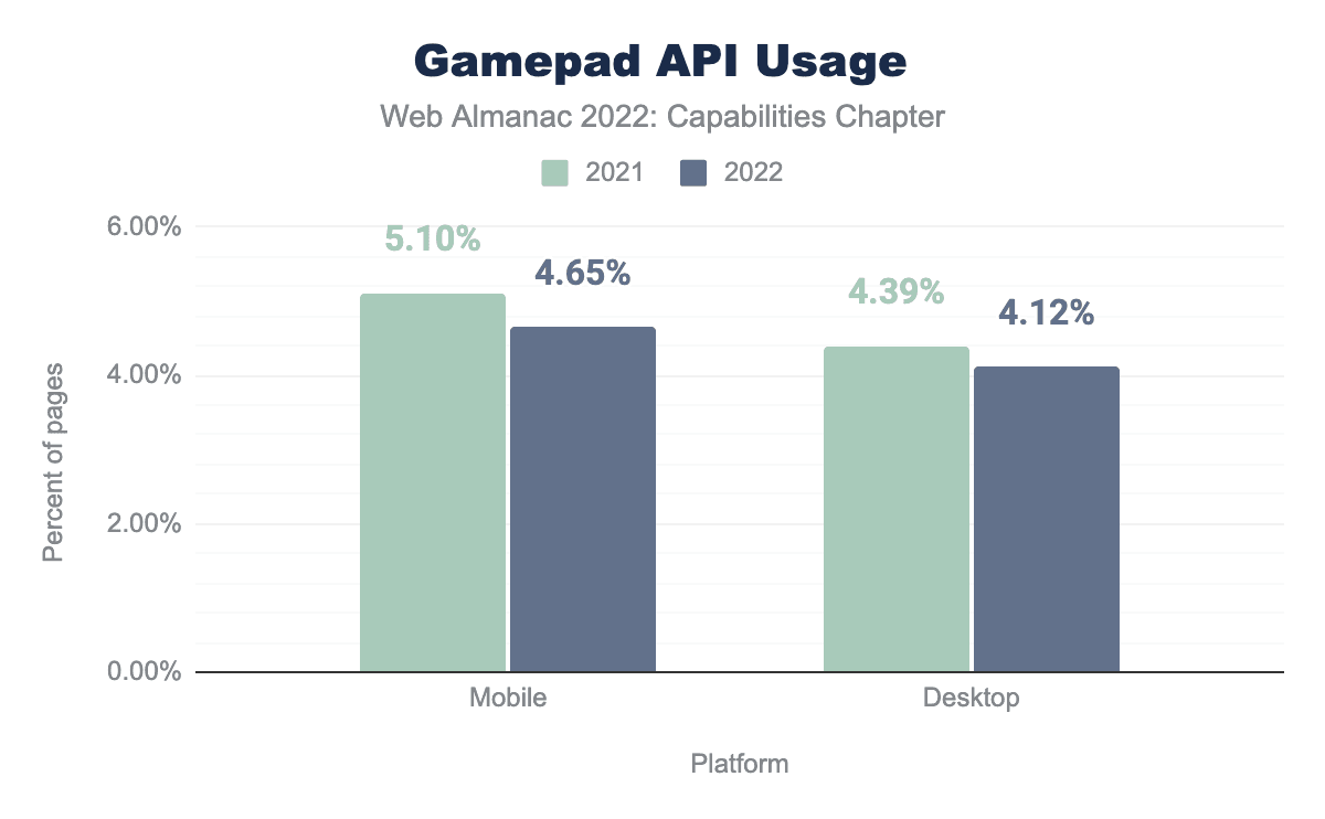 ゲームパッドAPIの使用は、デスクトップで2021年の4.39%から2022年には4.12%へと減少しました。モバイルでは、2021年の5.10%から2022年には4.65%へと減少しました。その結果、今年ゲームパッドAPIはデスクトップで七番目に、モバイルで六番目に多く使用される機能となりました。