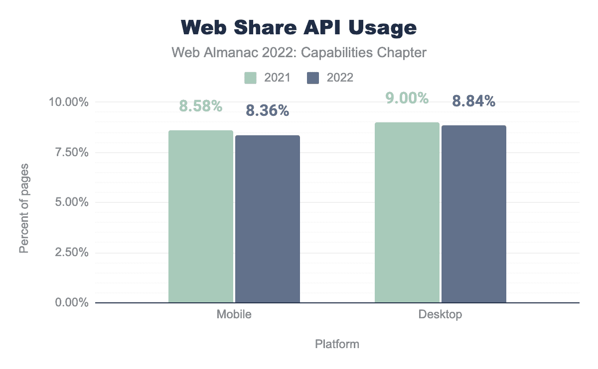 Web Share APIは、デスクトップで2021年の9.00%から2022年には8.84%へ、モバイルでは2021年の8.58%から2022年には8.36%へと使用率が減少しました。その結果、今年、Web Share APIはデスクトップとモバイルの両方で二番目に多く使用されたAPIとなり、昨年の二番目に多く使用された非同期クリップボードAPIに次ぐものとなりました。